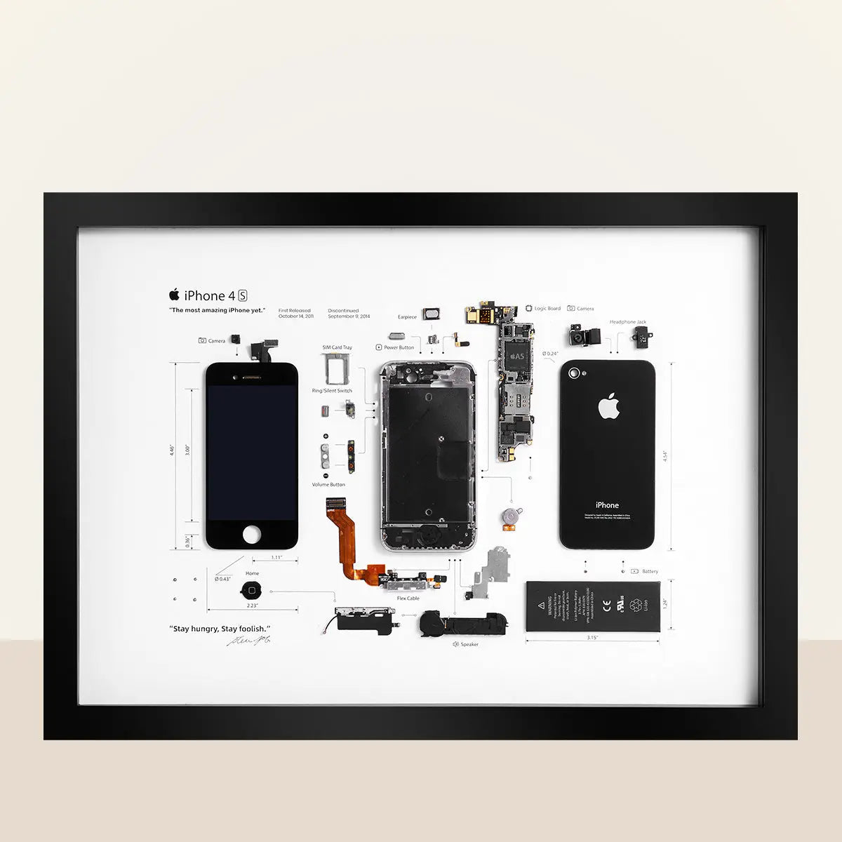 This deconstructed art frame is crafted using a real, professionally dismantled iPhone 4S, the fifth generation of the iPhone and one of the most emotionally significant devices in Apple’s history.
